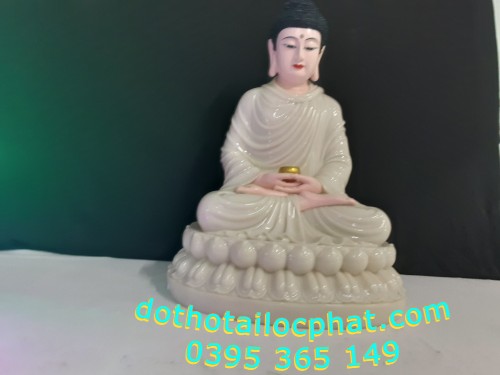 Tượng phật thích ca bằng bột đá màu trắng ngồi trên đài sen rất tỉnh tâm, 2 tay đan nhau, cụm tóc xoăn ốc màu đen, khuôn mặt thanh thoát. Hai tay tượng phật thích ca xếp ngay ngắn để giữa hai đùi, hai bàn tay bắt ấn thiền, ấn chuyển pháp luân hoặc ấn kim cương hiệp chưởng. Ngoài ra, tay tượng Phật có thể cầm chiếc bát và thường là nhìn xuống biểu thị cho sự quan sát về nội tâm.